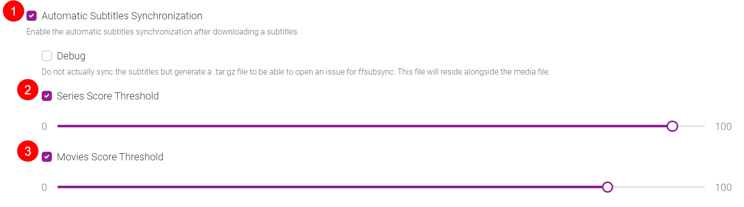 1. Select the minimum score (in percentage) required for a subtitle file to be downloaded.