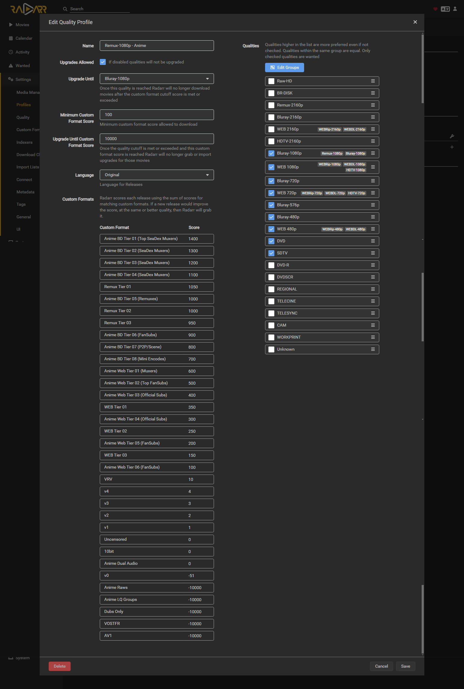 Once the custom formats have been imported you can set the scores as above. To do this go to Settings => Profiles and select the Remux-1080p - Anime profile that was setup before.