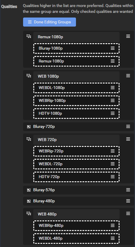 We need to add Bluray-1080p Remux and Bluray-1080p into a group together, HDTV-1080p into the same group as WEBDL-1080p and WEBRip-1080p, and lastly HDTV-720p into the same group as WEBDL-720p and WEBRip-720p so that the scoring will work correctly.
