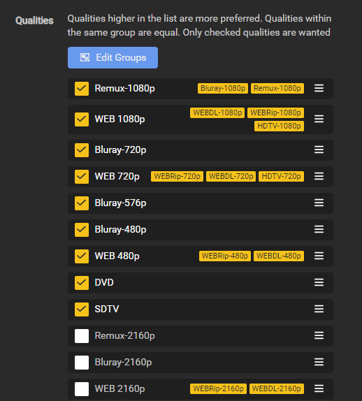 We need to create a new profile called Remux-1080p - Anime due to the way anime can be named we will need to merge a few qualities together see here for an example.