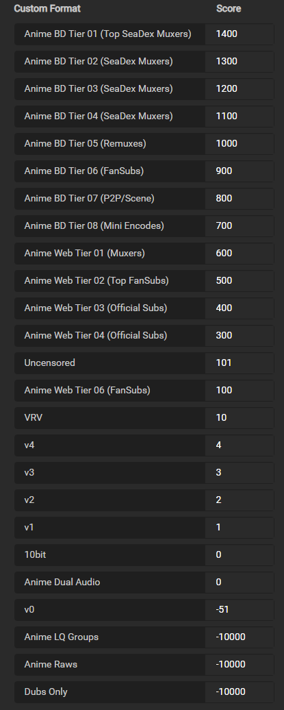 If you must have Dual Audio releases set the Minimum Custom Format Score to 2000 in the Remux-1080p - Anime profile that you setup earlier.