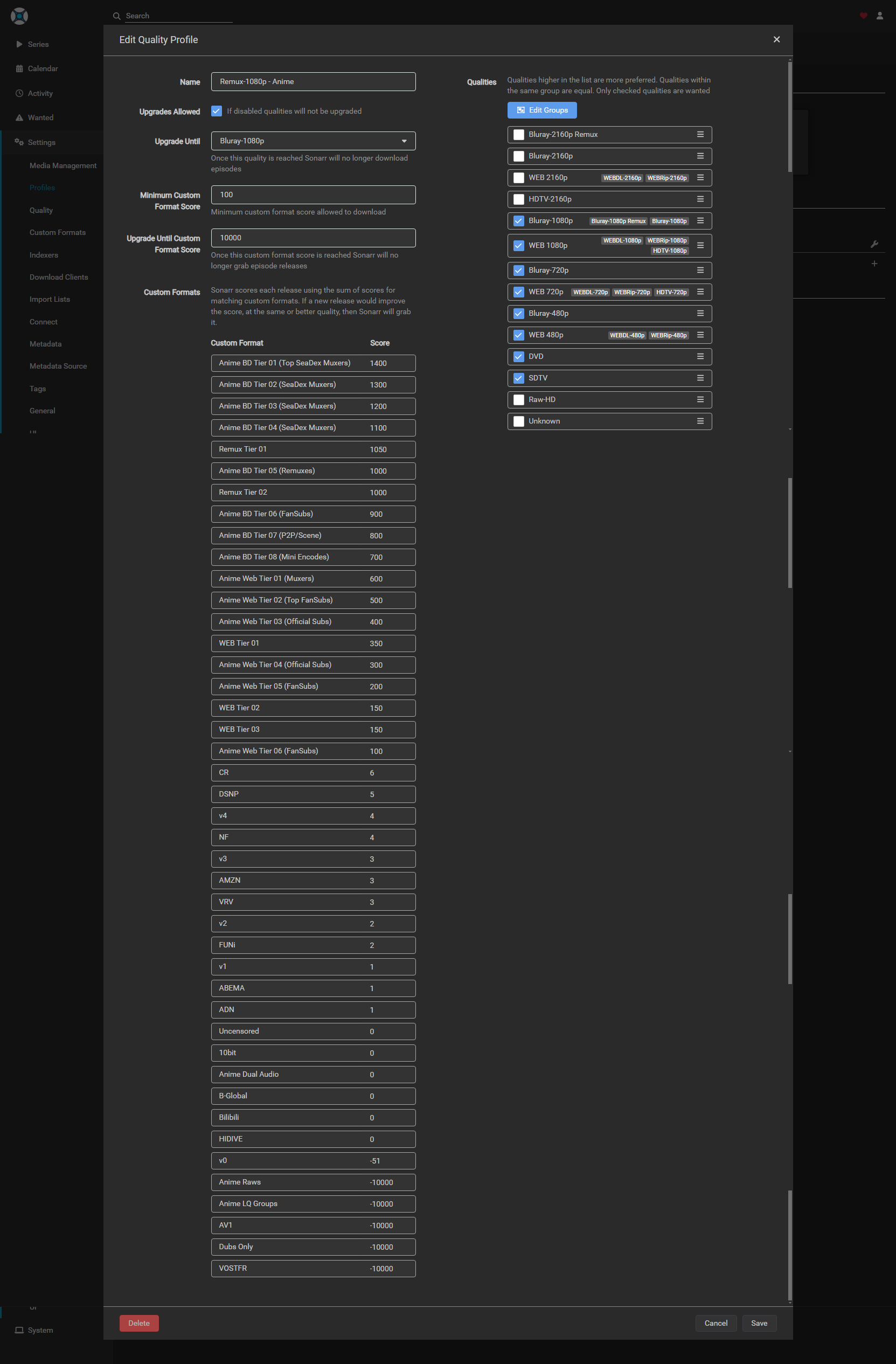 Once you have set your preferred scoring you will need to make one more change to your Remux-1080p - Anime profile.