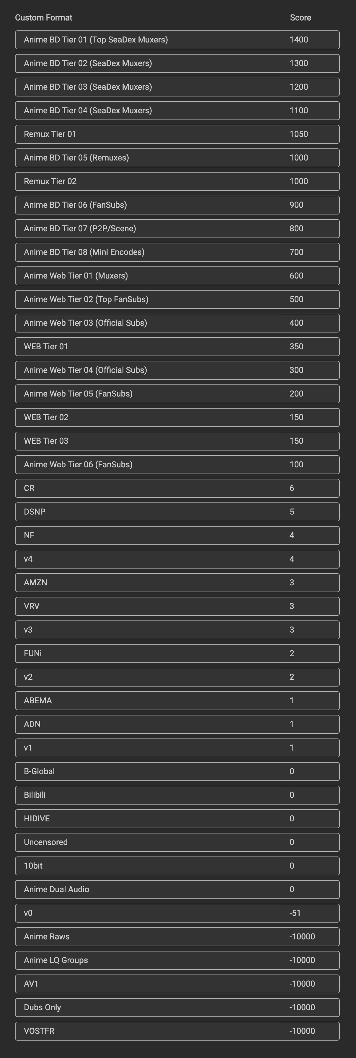 | Custom Format | Score | Trash ID |