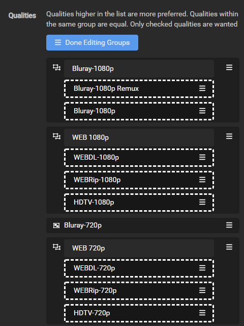 We need to add Bluray-1080p Remux and Bluray-1080p into a group together, HDTV-1080p into the same group as WEBDL-1080p and WEBRip-1080p, and HDTV-720p into the same group as WEBDL-720p and WEBRip-720p so that the scoring will work correctly.