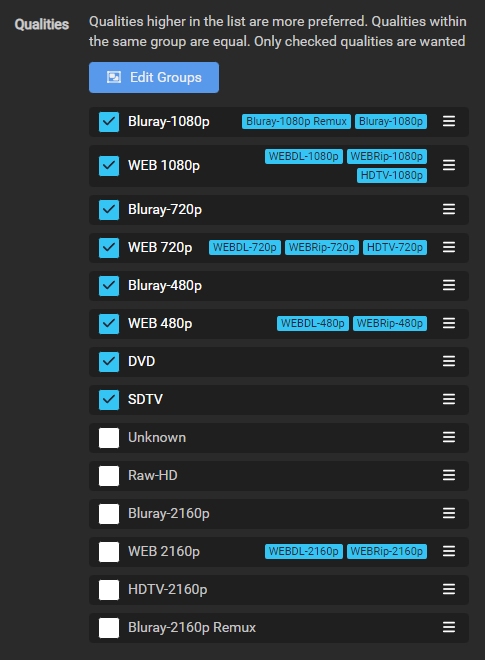 We need to create a new profile called Remux-1080p - Anime due to the way anime can be named we will need to merge a few qualities - see here for an example.